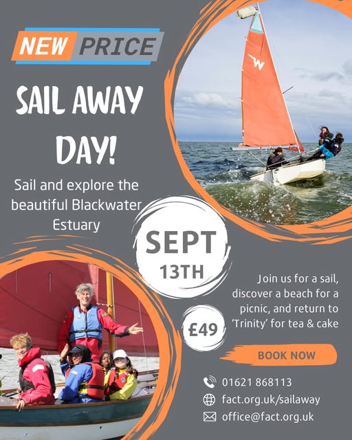 September Sail Away Days ⛵ Join us for a day of adventure and fun out on the water! Spend the day on the Blackwater Estuary, discover a beach for a picnic lunch and then return to ‘Trinity’ for tea, cake and an epilogue. 🍰 Our Sail Away Days are suitable for ages 9 - 90 - no experience necessary! Bring the family, a friend or even make some new ones! 👋 Book your place on a boat now! Now at a new price of £49 per person. Check out fact.org.uk/sailaway for more details or contact the office info@fact.org.uk (fb)