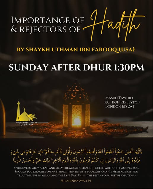 We are honoured to host Shaykh Uthman ibn Farooq (USA) this Sunday, 20th April for a powerful talk on: “The Importance of Hadith & Refuting the Rejectors” In a time where doubts are spreading and the Sunnah is under attack, this is a vital reminder for every Muslim — especially our youth — to stay firm upon the truth with knowledge and clarity. Don’t miss this opportunity to benefit from a renowned da’ee and defender of authentic Islam. (fb)