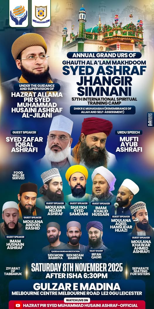 🌙 ANNUAL GRAND URS & 57th INTERNATIONAL SPIRITUAL TRAINING CAMP 🌙 Under the guidance and supervision of Hazrat Allama Pir Syed Muhammad Husaini Ashraf Al-Jilani Join us for the blessed Urs of Ghauth Al-A’lam Makhdoom Syed Ashraf Jhangir Simnani (رحمة الله عليه) — a night of Dhikr, Muhasabah (self-assessment), and spiritual inspiration. 🗓 Saturday 8th November 2025 🕕 After Isha – 6:30 PM onwards 📍 Gulzar E Madina, Melbourne Centre, Melbourne Road, Leicester LE2 0GU 🎙 Guest Speakers Include: Syed Zafar Iqbal Ashrafi | Mufti Ayub Ashrafi | Moulana Nizam Ashraf | Shaykh Syed Samdani | Imam Khalid Hussain | Moulana Aqeel Hanslidar Hijazi | Moulana Khawar Ahmed Ashrafi | Imam Husnain Ashraf | Moulana Abdoel Rashid Qasida Burdah Recitation by Sidi Moin & Sidi Nizam Babriya Naat Sharif by Irfan Qadri 🍽 Food will be served 🧕Separate seating for sisters 🕋 Ziyarat of Tabbaruk 📡 Watch Live on YouTube: Hazrat Pir Syed Muhammad Husaini Ashraf – Official Come with your family and friends and benefit from an evening of remembrance, reflection, and spiritual upliftment. (fb)