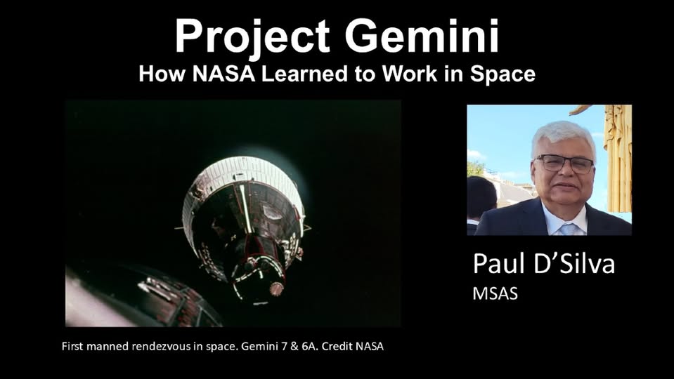 MSAS' Paul D'Silva usually fronts the meetings but this week, after the speaker had to cancel, presented a talk on the Gemni Project. Paul described how NASA had to squeeze a program between Mecury and Apollo in order to fufil President J F Kennedy's dream to land a man on the Moon by 1970. (fb)