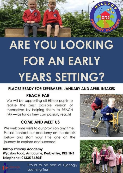 Helping all children find their talent We are a caring primary school on Wyaston Road in Ashbourne with a teacherled Nursery and enhanced resource provision which means we can support children with disabilities and high level needs. We teach children aged 311 and offer onsite wraparound care from 7. 30am until 6pm. We encourage our pupils to REACH FAR in everything they do but we are also focused on whole child development and wellbeing.