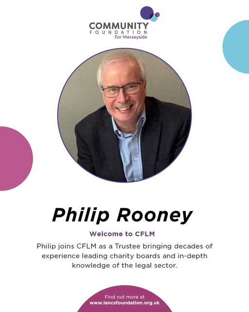 We’re delighted to welcome Philip Rooney as our newest Trustee at CFLM 🎉 Philip has been involved with us for over 15 years and brings a wealth of experience to our Board. Reflecting on his journey, he shared: “I have seen the immense benefit that supporting local community groups can bring. I never cease to be impressed by the social return generated by the commitment and resourcefulness of volunteers.” Read more about Philip’s appointment and the experience he brings to CFLM here: https://cfmerseyside.org.uk/news/meet-our-latest-trustee-philip-rooney (fb)