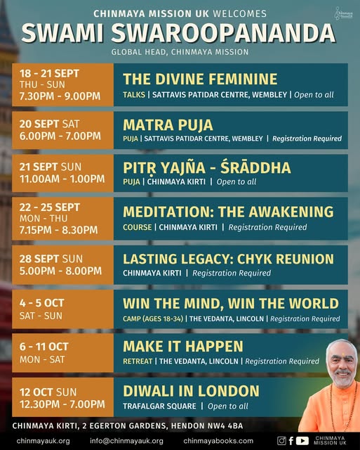This September and October, we are blessed to welcome Pujya Swami Swaroopananda, Global Head of Chinmaya Mission, for a series of powerful events across London and beyond. From inspiring talks to sacred pūjās, meditation courses, youth camps, and retreats — there is something for everyone! 📅 Highlights include: ✨ The Divine Feminine — 18–21 Sept, Wembley ✨ Matru Puja — 20 Sept, Wembley ✨ Pitṛ Yajña – Śrāddha — 21 Sept, Hendon ✨ Meditation: The Awakening — 22–25 Sept, Hendon ✨ Lasting Legacy: CHYK Reunion — 28 Sept, Hendon ✨ Win the Mind, Win the World (Ages 18–34) — 4–5 Oct, Lincoln ✨ Make It Happen Retreat — 6–11 Oct, Lincoln ✨ Diwali in London — 12 Oct, Trafalgar Square 🙏 Don’t miss this extraordinary opportunity to learn, reflect, and celebrate together with Swamiji. Mark your calendars! (fb)
