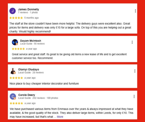 🌟🌟🌟🌟🌟 We’re feeling the love! Thank you to everyone who’s left us glowing 5-star reviews — your support helps us continue to change lives at Emmaus Leeds 💚 Every purchase, donation, and kind word helps provide meaningful work, a home, and hope to people rebuilding their lives after homelessness. If you’ve had a great experience with us, why not leave a review and help others discover the difference Emmaus Leeds can make? (fb)