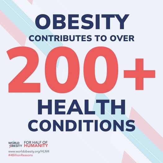 🧠💙 Obesity contributes to more than 200 health conditions - including heart disease, type 2 diabetes, cancer, liver disease, and many more. It is not a lifestyle issue - it is a chronic, complex disease that drives and deepens the global burden of noncommunicable diseases (NCDs). Without recognising and addressing obesity, there can be no real progress on NCDs, Universal Health Coverage, or global health equity. By 2035, nearly 4 billion people will be living with overweight or obesity - almost half of humanity. It’s time for governments to act: to integrate obesity into NCD strategies, ensure access to care, and tackle the environments driving this epidemic. 🌍 #4BillionReasons to act - because addressing obesity means preventing disease, improving health, and protecting futures. 🔗 www.worldobesity.org/HLM4 #ForHalfOfHumanity #NCDs #GlobalHealth #ObesityPolicy #HealthForAll #UniversalHealthCoverage (fb)
