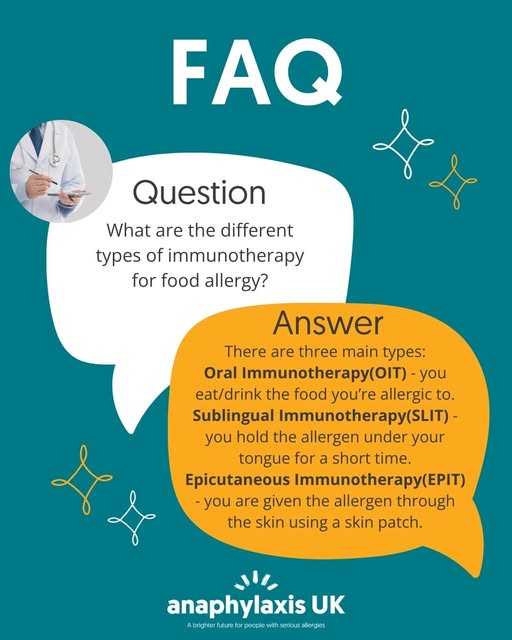 ❔ Frequently Asked Questions ❔ Immunotherapy is a medical treatment that aims to desensitise your immune system to the food you are allergic to, meaning you’re less likely to have a reaction. It does this by gradually exposing you to small amounts of that food under careful supervision, slowly building up the amounts over the weeks and months. Find out more in our Immunotherapy for food allergies factsheet: https://www.anaphylaxis.org.uk/fact-sheet/food-immunotherapy/ Have a question for our Helpline Team? Visit: https://www.anaphylaxis.org.uk/contact-us/ #FoodAllergy #Immunotherapy (fb)