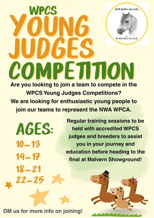 🌟 Calling All Young Welsh Pony Enthusiasts! 🌟 Are you passionate about the Welsh breeds? Want to level up your knowledge and represent the NWA WPCA at the WPCS Young Judges Final in Malvern? 🏆 This is your chance! 🎤✨ We’re on the lookout for young people like YOU to join our WPCS Young Judges Team! Throughout the year, we’ll be running fun, hands-on training sessions to help you build your judging skills and confidence — no experience needed, just a love for the breed and a willingness to learn. 🐴📚 ✅ Learn from experienced judges ✅ Make new friends who share your passion ✅ Compete at a national level ✅ Represent your region at Malvern! 📍 Training sessions will take place across the year — message us for details or to sign up! Let’s shape the future of Welsh Pony judging, together. 🌿 #YoungJudges #WPCS #NWAWPCA #WelshPonyPride #FutureOfTheBreed (fb)