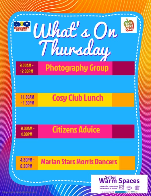Good morning everyone. Todays cosy club lunch is honey mustard ham, roast potatoes and mixed vegetables followed by a choice of delicious desserts. 😋We look forward to seeing you all here. If you would like an appointment to see citizens advice please contact the centre on: 0151 924 0122 (fb)