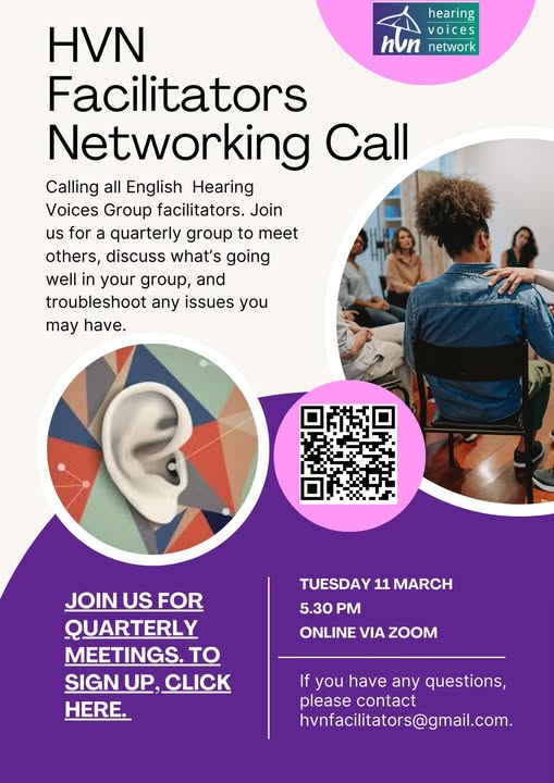 HVN Facilitators Networking Call: Calling all English Hearing Voices Group facilitators. Join us for a quarterly group to meet others, discuss what's going well in your group, and troubleshoot any issues you may have. First meeting - Tuesday 11 March, 5.30pm online via Zoom. If you have any questions email hvnfaciltiators@gmail.com Sign up link: https://zoom.us/meeting/register/03L5c3a9SJa2sXQc_1SToA Please share with any group facilitators you think may be interested. Thanks! (fb)