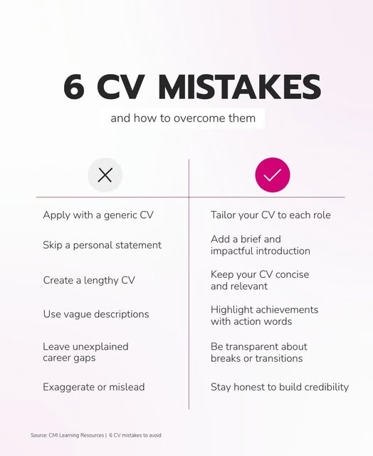 🚫 6 CV MISTAKES TO AVOID 🚫 Small mistakes can cost big opportunities when it comes your CV. Look out for these common mistakes to help you make a good impression and boost your success rate when applying for jobs. Comment your thoughts or tips below and reshare if you found this post helpful 💬 #BetterManagers #Jobs #Careers #Hiring (fb)