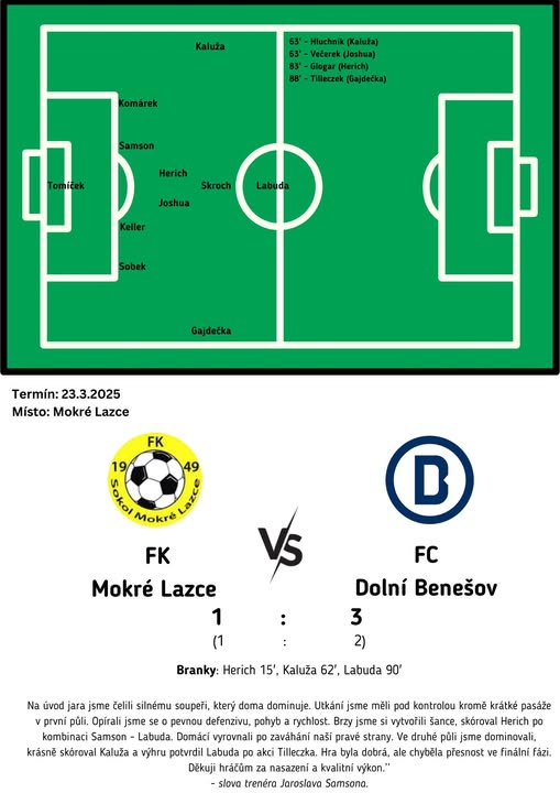 Oficiální web fotbalového týmu FC Dolní Benešov FC Dolní Benešov Poslední utkání Stadión Dolní Benešov FC Dolní Benešov Mokré Lazce Minulé zápasy dorostu Národní sportovní agentura SAMSONOVA TOUR s. r. o. – Partner klubu RESTAURACE NA HŘIŠTI Moravskoslezský Kraj Občerstvení hřiště Zábřeh UPOZORNĚNÍ .