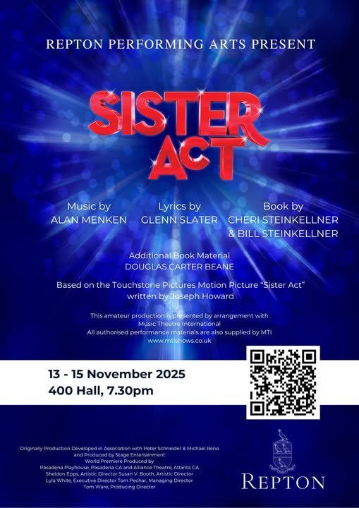 Repton Performing Arts presents: Sister Act 🎶 Get ready for an unforgettable night of music, laughter and joy as Repton pupils take to the stage in the hit musical comedy Sister Act! 📅 Thursday 13 – Saturday 15 November 2025 | 7:30PM 📍 400 Hall Theatre, Repton School 🎟️ Tickets: £12 Adults | £6 Concessions (including one complimentary drink) 👉 https://reptonschoolevents.littleboxoffice.com/browse?language=en All profits will be donated to South Derbyshire CVS, supporting the local Food Hub to help tackle food poverty in our community. With uplifting gospel-inspired music, dazzling dance numbers and endless energy, Sister Act is guaranteed to raise the roof - and your spirits! #ReptonSchool #ReptonPerformingArts #SisterAct #MusicalTheatre #ReptonCommunity #SouthDerbyshireCVS (fb)
