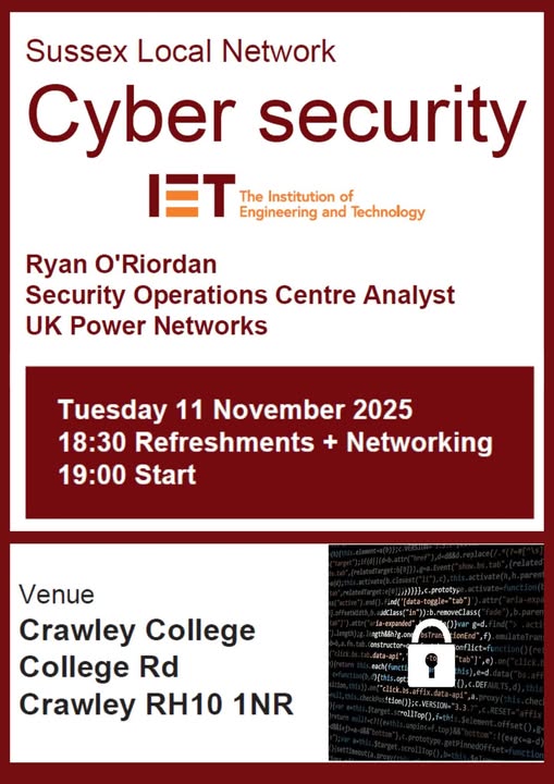 IET Education presents this talk, which will provide an introduction to cybersecurity and explain how a cyber function operates within an organization. Ryan will share insights from his role as an Incident Response Analyst at UK Power Networks, including how we detect, investigate, and respond to security incidents. The session will also include real-world examples such as Stuxnet and the 2015 Ukrainian power grid attack to illustrate the impact of cyber threats on critical infrastructure. Date: 11 Nov 2025 Time: 6.30pm Venue: Crawley College Contact person - Ian Marshall Book here - https://localevents.theiet.org/register.php?event=d45221 #ForThoseWhoDoMore Crawley Borough Council (fb)