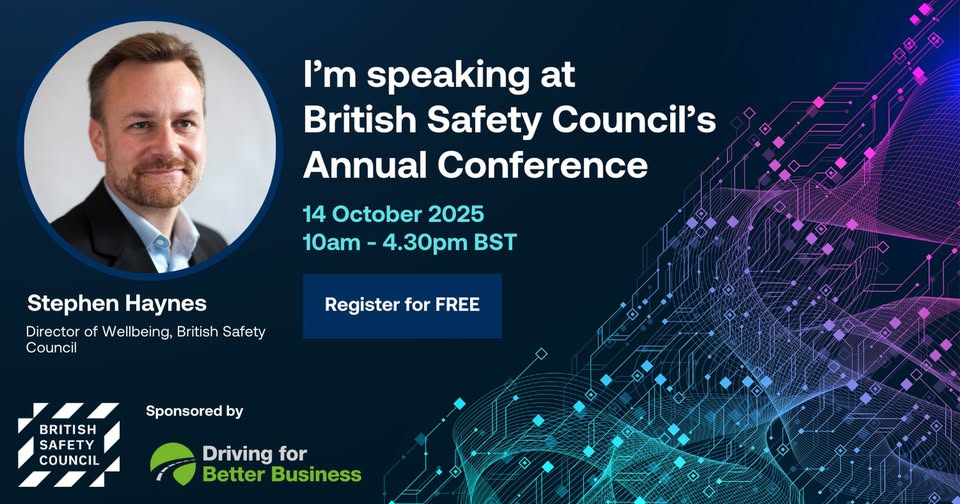 📢 Speaker Spotlight: Stephen Haynes We’re excited to welcome Stephen to British Safety Council’s 15th Annual Conference 2025, a FREE virtual event on 14 October, exploring Workplace Health, Safety and Wellbeing in an AI-enabled World. Stephen is a workplace health and wellbeing strategist with 30+ years’ experience across HR, consulting, and leadership - helping organisations worldwide address people risks by building resilient support systems, stress management frameworks, culture and behavioural change programmes. Stephen holds a Master's in Workplace Health & Wellbeing and currently serves on the ISO International Human Resource Management and Human Capital Advisory Board. ✨ Don’t miss Stephen’s expert insights on AI and the future of workplace safety. 📅 14 October 2025 | 💻 FREE Virtual Conference Register today: https://ow.ly/Qkzm50WWCeg #AnnualConference2025 #HealthAndSafety #AI #FutureOfWork #RiskAssessment #WorkplaceWellbeing (fb)