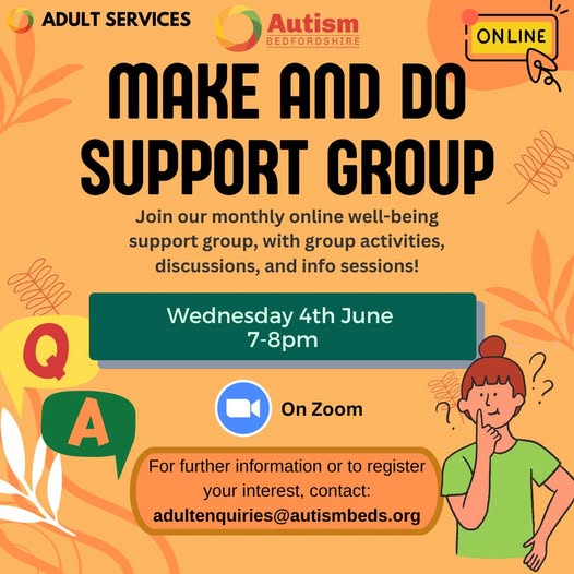 🌟 Make and Do Support Group 🌟 Join our monthly online well-being support group, featuring engaging group activities, insightful discussions, and informative sessions! 💬✨ 📅 Date: Wednesday, 4th June 🕖 Time: 7-8pm 📍 Platform: Zoom For further information or to register your interest, contact: adultenquiries@autismbeds.org #Autism #AutismAwareness #AutismAcceptance #AutismCommunity #AutismSupport #ASD #AutismLife #AutismFamily #DifferentNotLess #AutismJourney (fb)