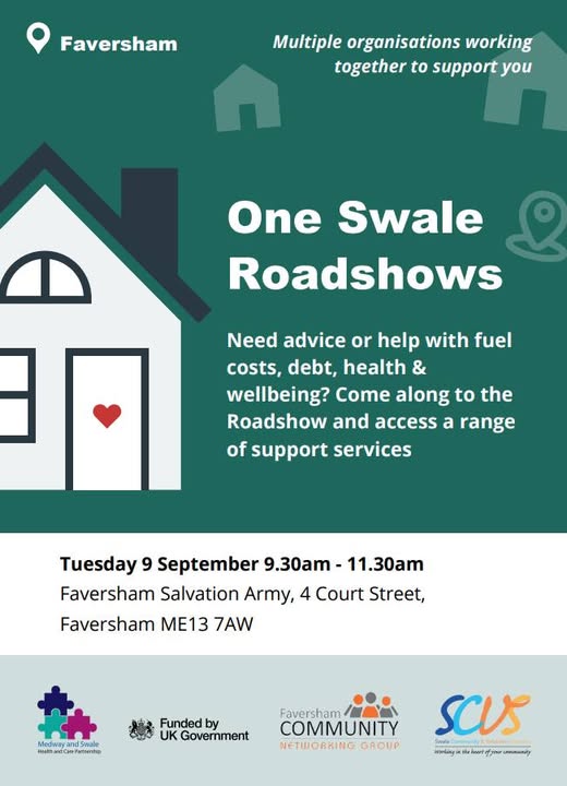 Our drop-in services are open as usual this week - come and chat with a friendly face! On Tuesday we'll be at the Sheerness East Working Mens Club for advice, and we'll be available for a chat at Swale Borough Council's #oneswale roadshow in Faversham. (fb)