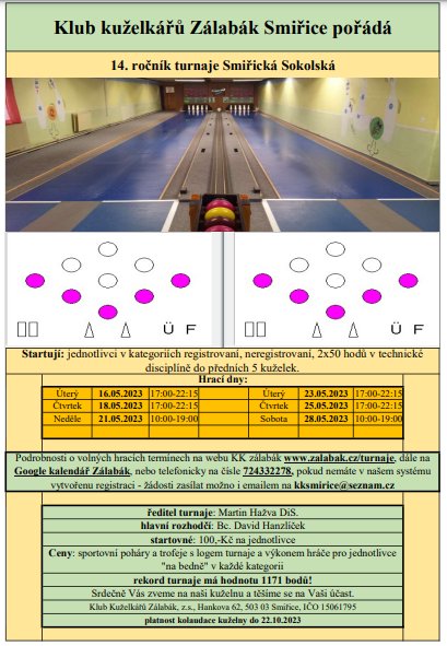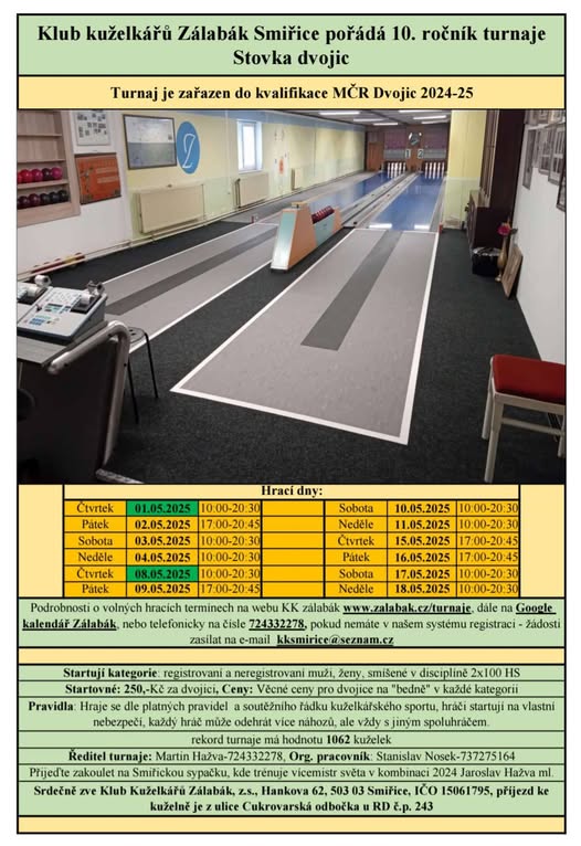 KK Zálabák Smiřice zdraví kuželkáře, v termínu od 1.5.-18.5.2025 proběhne na dvojce ve Smiřicích turnaj Stovka dvojic. Turnaj je zařazen do kvalifikace MČR Dvojic. Jednotlivé hrací dny jsou uvedeny v pozvánce, dále pak na stránkách www.zalabak.cz v sekci Turnaje je spuštěno registrační menu. Kdo nemá na stránkách www.zalabak.cz zřízen přihlašovací účet, může k přehledu obsazenosti turnaje využít Google kalendář Zálabák v levém sloupcovém menu stránek. Dále možno požádat o přihlášení e-mailem na kksmirice@seznam.cz, nebo zavolat 724332278 (Martin Hažva), či 737275164 (Stanislav Nosek). Kuželna je po rekonstrukci rozběhů a náhozových desek, předloni proběhla kompletní rekonstrukce, kříže, mantinely, dopadliště, výtah. Dráhy připravuje vicemistr světa v kuželkách Jaroslav Hažva ml. a jde mu to stejně skvěle jako hraní. Občerstvení zajištěno, máme točené pivo, utopence, klobásy, alko, nealko, espresso a jiné pochutiny. Kuželna je přímo u nádraží, takže je možno přijet i vlakem. Z druhé strany je pak možno přijet po dálnici D11 a sjet na exitu 104-Smiřice. Od D11 2 minuty autem. Startovné 250,-Kč/Dvojice. Věcné ceny pro dvojice na bedně v každé kategorii. Hrajeme dvojice registrovaní, neregistrovaní, muži, ženy, smíšené. Sbal si koule, kecky, dres, něco peněz a tradá na sypačku Zálabák do Smiřic....rekord kuželny v disciplíně 100 HS 571 kuželek! Do Smiřic srdečně zve tým KK Zálabák Smiřice. (fb)