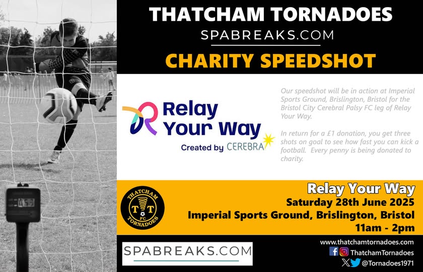 Thatcham Tornadoes Spabreaks.com Charity Speedshot is going on the road! Our speedshot will be in action on Saturday at Imperial Sports Ground, Brislington, Bristol for the Bristol City Cerebral Palsy FC leg of Relay Your Way. Relay Your Way is an epic relay across Britain championing the 1.5 million young people in the UK with disabilities, including half a million children living with brain conditions. The Relay sends the powerful message that sport, adventure and play should be inclusive to all. Launching in Glasgow on June 3rd, it will travel 2,500 km through almost every major city in Britain before finishing at the Parallel Windsor Festival of Inclusivity at Windsor Great Park on July 6th. In return for a £1 donation, you get three shots on goal to see how fast you can kick a football. Every penny is being donated to charity. A massive thank you to our sponsors Spabreaks.com for enabling us to continue our charity fundraising. Good luck to everyone taking part in Relay Your Way! 🖤💛🌪️⚽⚽⚽ #ThatchamTornadoes #CharitySpeedshot #fastestspeed #Grassrootsfootball #FootballFamily #Thatcham #WestBerkshire #spabreaks #InclusiveFootball #CerebralPalsy #Cerebra #RelayYourWay #BristolCityCerebralPalsyFC (fb)