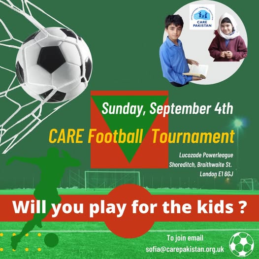 CARE football tournament is next weekend ! Join the fun and help raise vital funds for underprivileged children in Pakistan ! (fb)