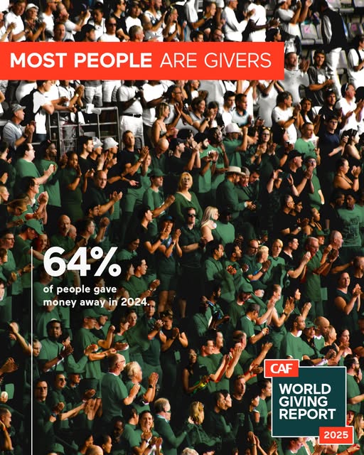 Generosity is the norm. The World Giving Report finds that most of us donated money to help others in 2024. Explore the full findings for more reasons to feel positive – and discover the opportunities for encouraging giving as a global community: https://worldgivingreport.org (fb)