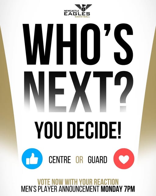 𝗬𝗢𝗨 𝗗𝗘𝗖𝗜𝗗𝗘 𝗢𝗨𝗥 𝗡𝗘𝗫𝗧 𝗦𝗜𝗚𝗡𝗜𝗡𝗚 👇 React either 👍 for centre or ❤️ for guard and we’ll reveal a new men’s team player joining us in that position next. ⏰ Come back Monday at 7pm for the signing announcement! 🗳️ Votes will be totalled across Facebook and Instagram. #WeAreEagles (fb)