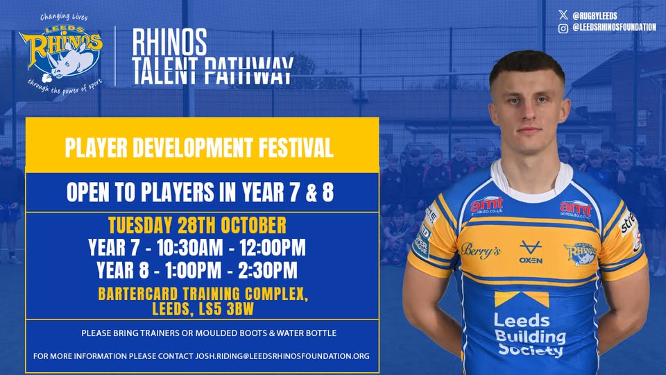 𝗕𝗼𝘆𝘀 𝗥𝗵𝗶𝗻𝗼𝘀 𝗧𝗮𝗹𝗲𝗻𝘁 𝗣𝗮𝘁𝗵𝘄𝗮𝘆 𝗦𝗲𝘀𝘀𝗶𝗼𝗻𝘀 🏉 Registration is open for our Year 7 & 8 Boys RTP sessions coming up in October half-term, at the Bartercard Training Complex🦏 Come and develop your skills with some free quality training! 🙌 📅 Tuesday 28th October 👦Year 7 ⏰ 10:30am - 12:00pm | Year 8 ⏰ 1:00pm - 2:30pm 📍Bartercard Training Complex, LS5 3BW Sign up here 👉 https://tr.ee/XW56j7 (fb)