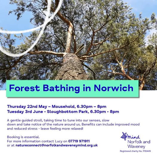 As the beautiful weather continues, step outside and join Nature Connect for Forest Bathing with two upcoming sessions. The perfect opportunity to slow down, tune into your senses and take notice of nature around us! 🌳🌿 📅 Thursday, 22nd May 🕐 6.30pm – 8pm 📍 Mousehold 📅 Tuesday, 3rd June 🕐 6.30pm - 8pm 📍 Sloughbottom Park To book your place, contact natureconnect@norfolkandwaveneymind.org.uk (fb)