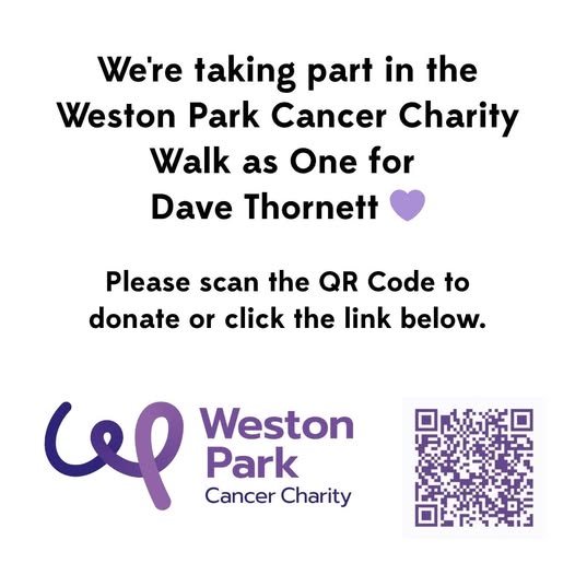 In November 2024 our friend and colleague Dave Thornett was diagnosed with terminal pancreatic cancer. Devastating news for all that know him, none more than Jo his partner of too many years to mention, close family and friends. The care Weston Park have provided has been first rate, and the treatment has bought him time with those he loves. 💜 Dave is one of the good ones and we feel privileged to have him in our world. Funny, smart and all round good un. Lots of us have wanted to help in a situation where we are helpless, so let's show our support and love by raising some cash in Dave's name and make a difference for others having a tough time with cancer. To donate please click the link below or scan the QR Code. https://walk-as-one-2025.raiselysite.com/jane-austin-team (fb)