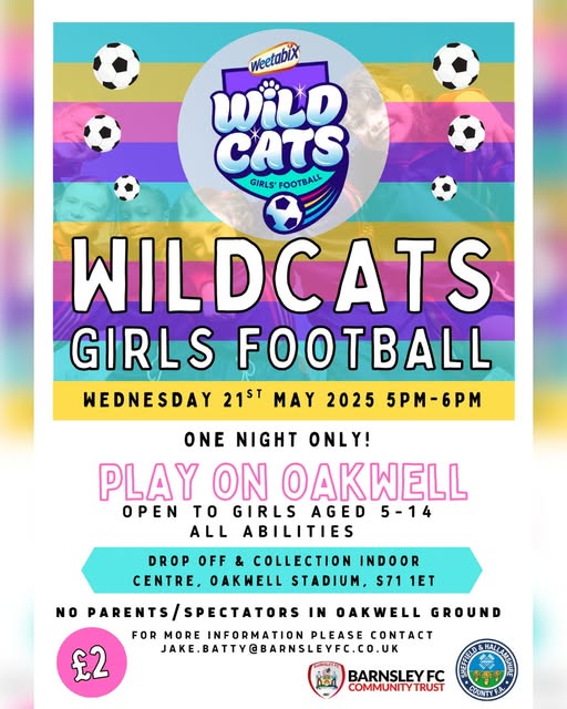 🔥 ONE NIGHT ONLY – WILDCATS PLAY ON OAKWELL! 🔥 Join us for a special one-hour session where you’ll get to play right on the pitch at Oakwell. 📅 Wednesday 21st May ⏰ 5:00 – 6:00 PM 💷 £2 Drop off/Collection from the Indoor Training Centre, Oakwell Stadium, S71 1ET. Strictly no parents/spectators are allowed in Oakwell Stadium for Health & Safety reasons. This is in place of the session at Hoyland Leisure Centre for one week only, we will be back to Hoyland on Wednesday 28th May. Book Now: https://loom.ly/ryFaglQ (fb)