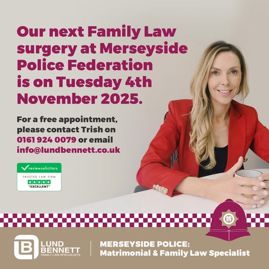 #MemberServices Family Law Surgery upcoming for members Kirsten Bennett is a dedicated Family Law Solicitor for Merseyside Police Federation. Kirsten and her team offer our members a free initial 60-minute consultation, a reduced fixed fee Divorce and discounted hourly rates. They specialise in all areas of matrimonial law including divorce, finances and pension on divorce, child arrangements, cohabitation and civil partnership disputes. If you cannot make the surgery date at Federation office, then please feel free to contact Kirsten on info@lundbennett.co.uk to arrange a free consultation directly. (fb)