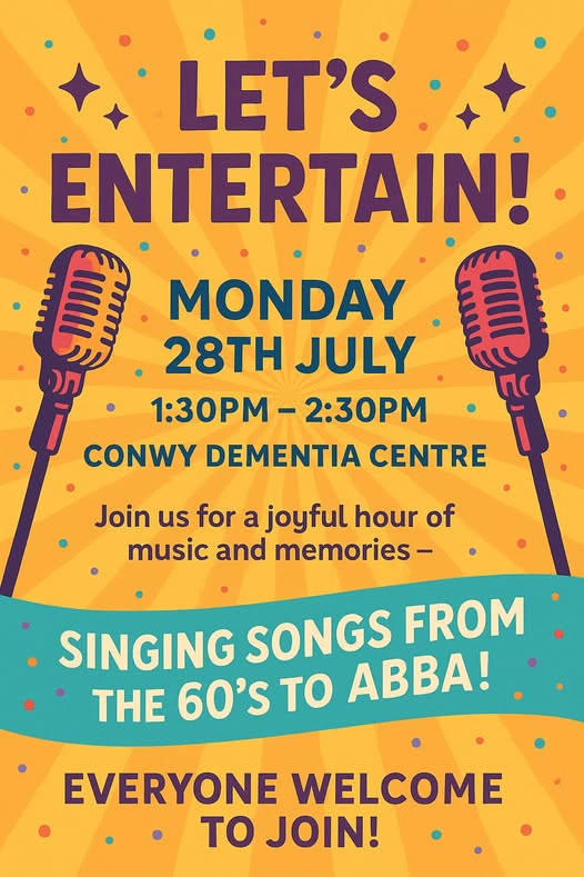 Join us at our Conwy Dementia Centre for an afternoon of entertainment! When: Monday 28th July, 1.30pm-2.30pm Everyone is welcome and we hope to see you there ☺️ Address: Quinton Hazell Enterprise Parc, Glan Y Wern Road, Colwyn Bay, LL28 5BS (fb)