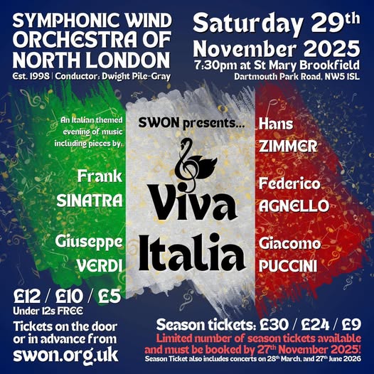 Tickets for our 29th Nov concert are now on sale! Including our sparkly NEW season tickets! 🎟️ which also gain you entry to our concerts on 28th March & 27th June 2026! 🎶🦢🎶 https://swon.sumupstore.com #windband #windorchestra #symphonicwindorchestraofnorthlondon #music #woodwind #brass (fb)