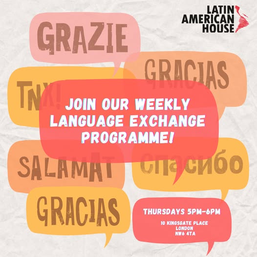 ✨ Join us for the Language Exchange Programme! 🌍🗣️ 📅 Every Thursday ⏰ 5 PM - 6 PM 📍 Latin American House Looking to improve your Spanish or English? Come practice in a fun, relaxed setting, meet new people, and expand your linguistic horizons! 🌟 No need to be fluent—just bring your enthusiasm! Sign up with this link: https://www.eventbrite.co.uk/e/language-exchange-programme-tickets-1307879014339?aff=oddtdtcreator 👋🎉 #LanguageExchange #PracticeMakesPerfect #MeetNewPeople #LearnANewLanguage ____________________________________________________________________________________ ✨ ¡Únete al Programa de Intercambio de Idiomas! 🌍🗣️ 📅 Todos los jueves ⏰ 17:00 - 18:00 📍 Latin American House ¿Quieres mejorar tu español o inglés? ¡Ven a practicar en un ambiente divertido y relajado, conoce gente nueva y amplía tus horizontes lingüísticos! 🌟 No necesitas hablarlo con fluidez, ¡solo trae tu entusiasmo! ¡Unete con este enlace: https://www.eventbrite.co.uk/e/language-exchange-programme-tickets-1307879014339?aff=oddtdtcreator 👋🎉 #IntercambioDeIdiomas #LaPrácticaHaceAlPerfeccionamiento #ConoceGenteNueva #AprendeUnNuevoIdioma (fb)