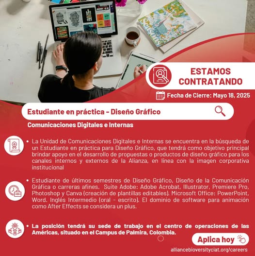 📢#Vacante | ¿Eres estudiante en últimos semestres de Diseño gráfico, Diseño de comunicación visual o carreras afines y te gustaría trabajar con nosotros? 🤓 ¡Te estamos esperando! Aplica a nuestra #vacante como Estudiante en práctica para el equipo de Comunicaciones Digitales. En esta posición apoyarás en el desarrollo de propuestas o productos de diseño gráfico para los canales internos y externos de la Alianza, en línea con la imagen corporativa institucional. 📍 Palmira 🗓️ mayo 18 👉 https://allbiociat.org/3GSasru (fb)