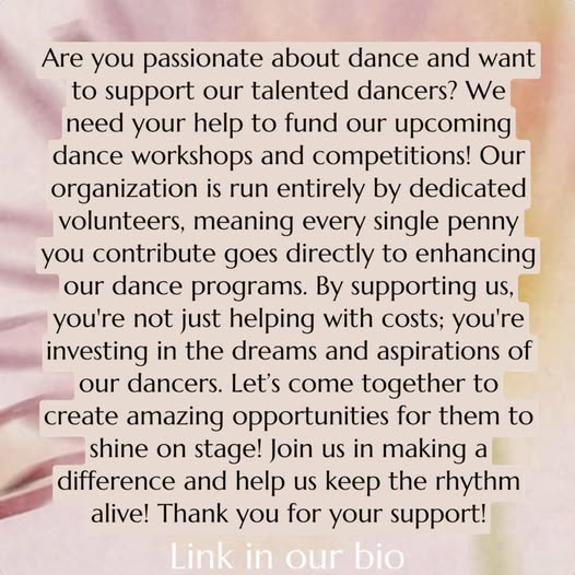 LINK IN BIO! Are you passionate about dance and want to support our talented dancers? We need your help to fund our upcoming dance workshops and competitions! Our organization is run entirely by dedicated volunteers, meaning every single penny you contribute goes directly to enhancing our dance programs. By supporting us, you're not just helping with costs; you're investing in the dreams and aspirations of our dancers. Let’s come together to create amazing opportunities for them to shine on stage! Join us in making a difference and help us keep the rhythm alive! Thank you for your support! (fb)
