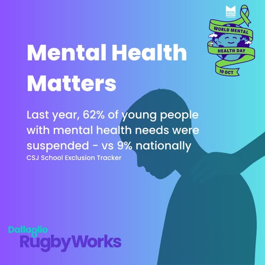 At Dallaglio RugbyWorks, we see every day how exclusion and poor mental health are closely connected. In the last academic year, 62.23% of children with social, emotional and mental health (SEMH) needs were suspended from school — compared to a national average of 9.33%. Behind those numbers are young people who often feel isolated, unheard and without the support they need. That’s where we step in. Through 1:1 mentoring, we give young people a trusted adult who listens, guides and believes in them. Through resilience workshops, we help them develop coping strategies, emotional awareness and self-belief. And through the values of rugby, we create a sense of teamwork and belonging that builds confidence on and off the pitch. This World Mental Health Day, we’re standing alongside every young person facing exclusion and mental health challenges💙 #WorldMentalHealthDay #MentalHealthMatters #EndTheStigma #ExcludedYouth #DallaglioRugbyWorks #Teamwork #Resilience #Belonging (fb)