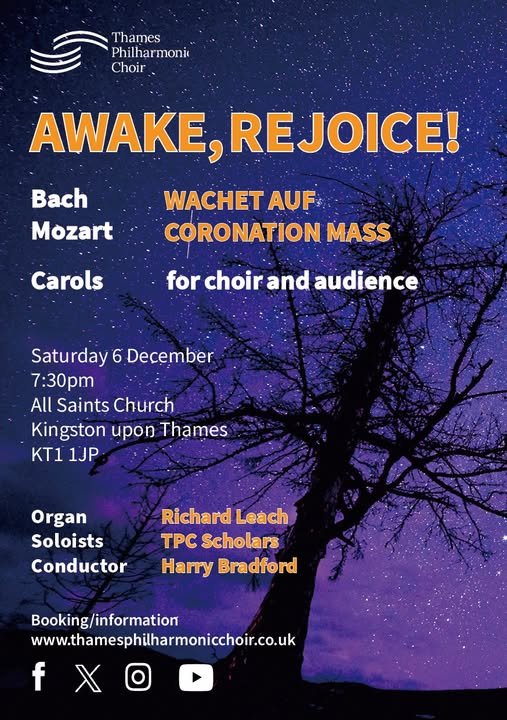 Thames Philharmonic Choir are holding a Christmas concert including Bach and Mozart on Sat 6th December in Kingston. Tickets at https://www.thamesphilharmonicchoir.co.uk/event-details/awake-rejoice (fb)