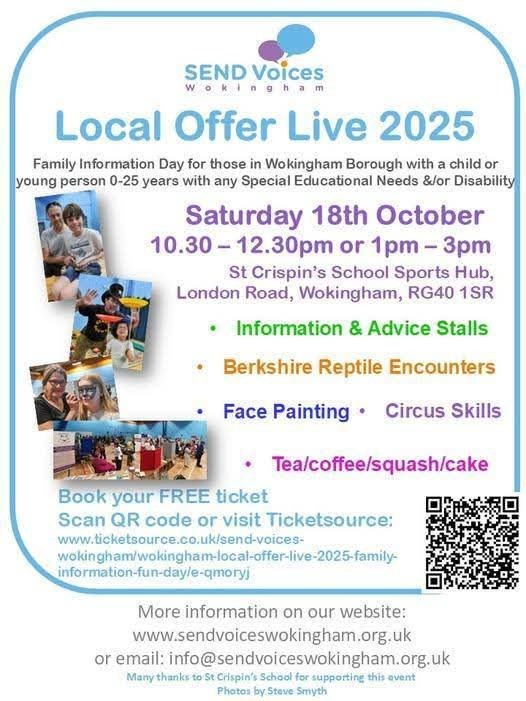 There's still time to get your FREE tickets to tomorrow's fantastic Family Information Day in Wokingham! Local Offer Live is organised by SEND Voices Wokingham and it's PACKED full of useful charities, organisations and information relevant to children and young people (aged 0-25 with any SEND) in Wokingham. To find out more and book your ticket, use this link: https://www.sendvoiceswokingham.org.uk/news/send/local-offer-live-2025-family-information-and-fun-day We're looking forward to seeing everyone tomorrow! #LOL2025 #wokingham #sendsupport #family #familyfriendly #children #ChildDevelopment #youngpeople #free (fb)