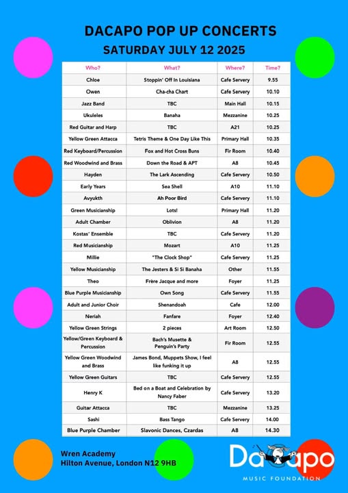 🎶🎉 DaCapo’s End-of-Term Pop-Up Concert! 🎉🎶 Join us for a joyful day of live music and community spirit! 📅 Saturday 12th July 🕘 9:55am – 3:00pm 📍 Wren Academy, Hilton Avenue, London N12 9HB 🎻 Solos & Small Ensembles 🎺 Orchestras,Jazz Bands & Singings 🎸 All Instruments – All Ages – All Levels 👶 From toddlers to adults – everyone’s performing! 🎟️ Free Entry – Drop in anytime! Bring your friends, family & loudest applause 👏 #DaCapoMusicFoundation #FamilyConcertNorthLondon (fb)