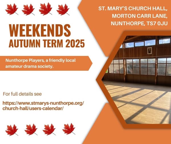 Groups meeting at St. Mary's Church Hall at the weekend: Nunthorpe Players. You can come and see their latest production, 'Curtain Up' on 11th - 13th September (see Nunthorpe Players for full details) or why not join the society to help with their upcoming pantomime? A warm welcome is assured. (fb)