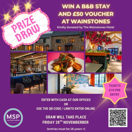 ✨ Win a Luxury Relaxing Getaway ✨ We’re giving you the chance to win a B&B stay at The Wainstones Hotel PLUS a £50 spending voucher 🏨🍷🍽️ 🎟 Tickets: just £10 each 📲 Buy online via the link https://shorturl.at/NWknP or use the QR code OR or pop into our office with cash. 💡 Bonus: All cash entries before 15th October will be DOUBLED thanks to our Big Give match fund campaign – twice the impact for the same price! 📅 The lucky winner will be drawn on Friday 28th November – don’t miss your chance! 👉 Get your ticket today and support our work while treating yourself to the chance of a luxury break. #prize #win #fundraising #domesticabuse (fb)