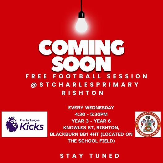 Stay tuned 👀 ⚽️ for our upcoming N E W session, which will be hosted in collaboration with Premier League Kicks. F R E E football session at Rishton's St. Charles Primary School field📍 For further information, please see below, and pay attention to the commencement date… Any more information contact - Amber.kenyon@stanleytrust.co.uk (fb)