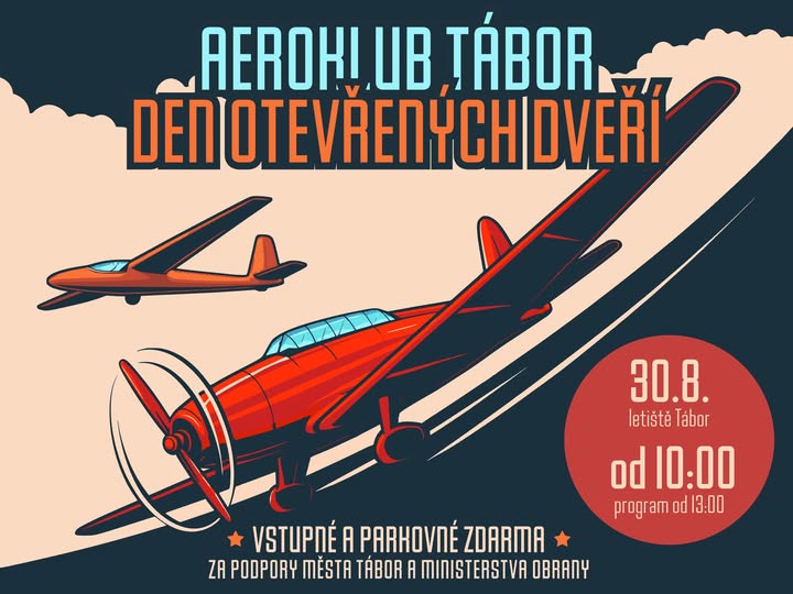 Letiště Tábor otevírá své brány – zveme vás na Den otevřených dveří! 🛩️ ✈️ Čekají vás dechberoucí ukázky letadel včetně průletu Gripenů, vystoupení Martina Šonky, bohatý doprovodný program a spousta zábavy pro celou rodinu 🤩 📅 Sobota 30. 8. od 10:00, Letiště Tábor – Čápův dvůr 💸 Vstup zdarma | 🚗 Parkování zdarma Přijďte si užít den plný leteckých zážitků! 🙌 (fb)