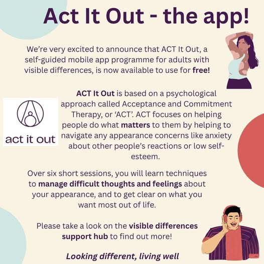 🌟 New App for Adults with Visible Differences Including Ichthyosis 🌟 We’re excited to share a brilliant new resource from our colleagues at the VTCT Foundation (Centre for Appearance Research (CAR) — the ACT It Out app! 📱 Designed with and for people who have a visible difference such as a skin condition, ACT It Out helps adults (16+) connect with what matters most to them and take steps toward living well - even when appearance concerns or social challenges get in the way. 💬 Based on Acceptance and Commitment Therapy (ACT), the app includes six short, self-guided sessions with practical exercises and skill-building tools. ✨ Free to use 📲 Available now on the App Store and Google Play 🧠 Created by researchers, clinicians, and people with lived experience Tagline: “Looking different, living well.” Learn more and download via the Visible Difference Support Hub 👇 🔗 https://visibledifferencesupporthub.com/act-it-out/ #Ichthyosis #VisibleDifference #ACTItOut #VTCTFoundation #MentalHealthSupport #BodyConfidence #AcceptanceAndCommitmentTherapy (fb)