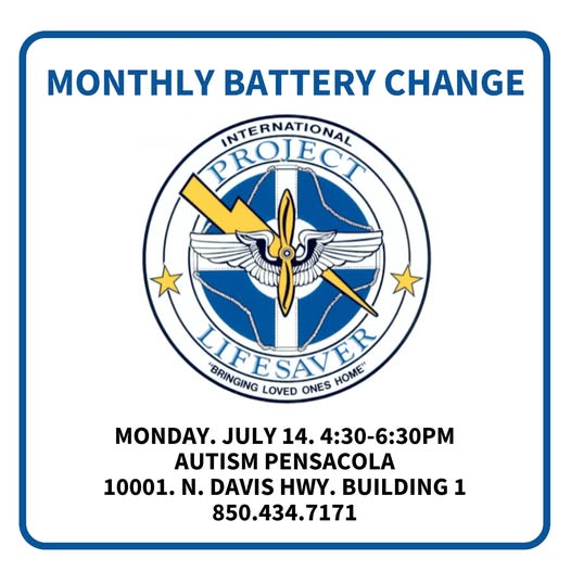🚨Don't forget to get those batteries changed!🚨 Stop by the office on Monday, July 14th, anytime between 4:30-6:30PM! We'll check your transmitter and send you home with a fresh new battery installed. 💙 #projectlifesaver #autismpensacola #autismawareness #autismadvocacy #escambiasearchandrescue (fb)