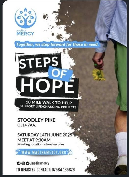 Steps of Hope: Turn Your Steps into Sadaqah! Open to brothers and sisters of ages 12+ Join us for a 10-mile sponsored charity walk to Stoodley Pike and help Madina Mercy deliver life changing projects. Along the way, enjoy breathtaking views, great company, and the knowledge that every step you take supports those in need. Date: Saturday 14th June Time: 9:30 AM Start Point: Parking View Point, White House, Littleborough OL15 0LG Duration: 5 hours (Including breaks) What to Wear & Bring: * Comfortable walking shoes * Weather-appropriate clothing/jackets * Water, snacks, and a packed lunch Registration Fee: £20 Sign up here: https://www.tickettailor.com/events/madinamercy/1695863 Fundraise & donate: Launch good page will be shared. Walk with purpose. Walk for Madina Mercy. For enquiries, contact Sister Thaira at 07584135876. (fb)