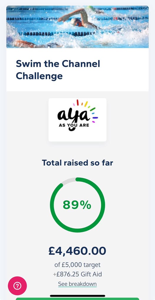 Swim the Channel Challenge Event date: Sunday 4th May We are so close to our target!!! Thank you!! 🤩 🙏 Team AYA and friends are taking up the challenge of swimming the length of the English Channel at the Sea Lanes in Brighton! 🏊 Collectively we will be swimming 32km in just 3 hours across 3 lanes on Sunday 4th May! 🤩 Please come & support us on the day! Donations gratefully received to continue to fund our low cost counselling work in the local community. Details via page below! https://donate.giveasyoulive.com/campaign/swim-the-channel-challenge (fb)