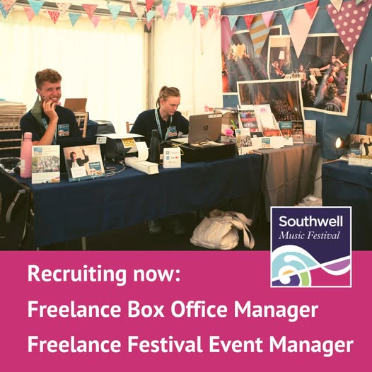 Would you like to be part of the Southwell Music Festival team? We are recruiting for two freelance roles to help deliver this year's Festival. Could you be our Freelance Box Office Manager or Festival Event Manager? Visit our website for more information about each role and how to apply. https://www.southwellmusicfestival.com/2025/05/recruiting-now-freelance-roles-with-southwell-music-festival/ (fb)