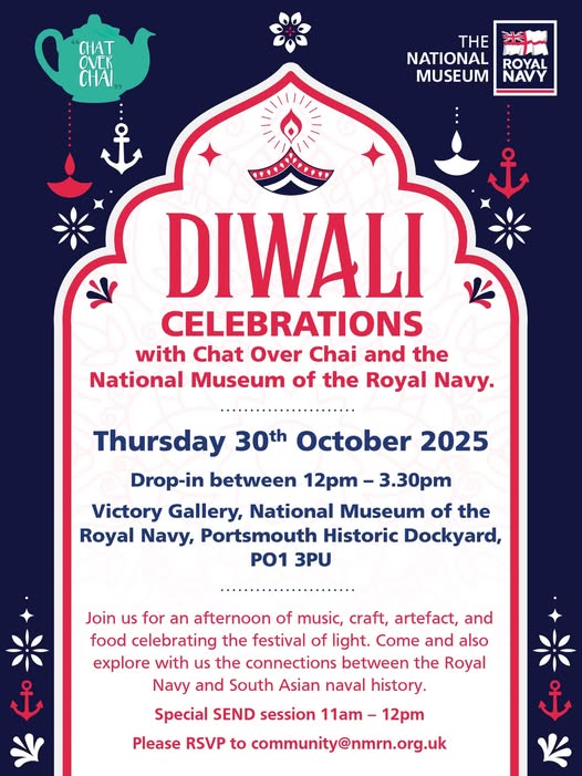 ✨We will be at Diwali Celebrations for a Chat Over Chair - we hope to see you there! ✨ As part of the #Diwali celebrations, our VOS representatives will be attending the Diwali Celebrations with Chat Over Chai and the National Museum of the Royal Navy🕯🕯🕯 Expect an afternoon of music, craft, artefact and food celebrating the Festival of Lights and you will get the chance to find out more about the connection between the Royal Navy and South Asian naval history! We'd love to see you there, it takes place as follows: 🗓Thursday 30th October 🕣1200-1520hrs 🔵Victory Gallery, National Museum of the Royal Navy, Portsmouth, Historic Dockyard, PO1 3PU If you would like to attend this event, please email the organisers at: community@nmrn.org Please note: This is not a VOS run event. We'd love to see you there 🌟✨💫 . . #Diwali2025 #VeteranSupport #Portsnouth #SolentRegion #CommunityOutreach (fb)