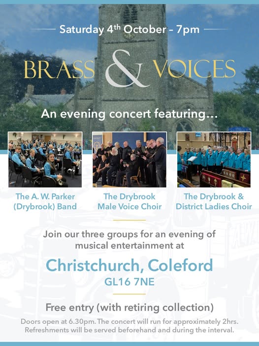 Join us on 4th October at Christchurch, Coleford where we will be taking to the stage in concert with our musical neighbours, the Drybrook & District Ladies Choir and the Drybrook and District Male Voice Choir. We look forward to seeing you there! (fb)